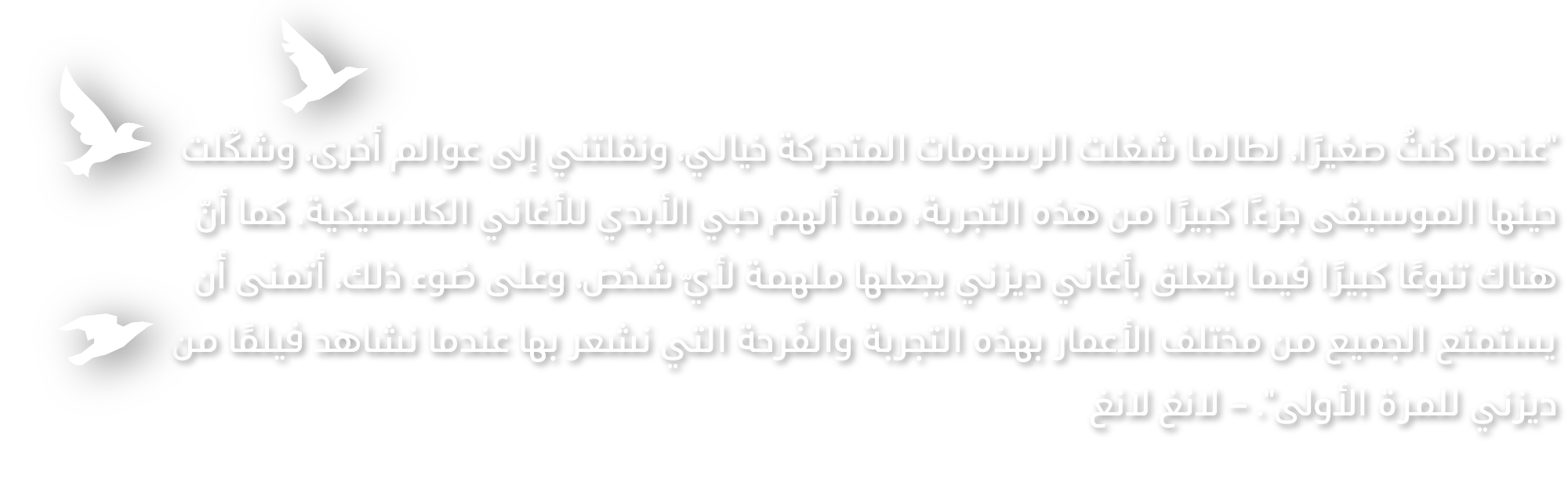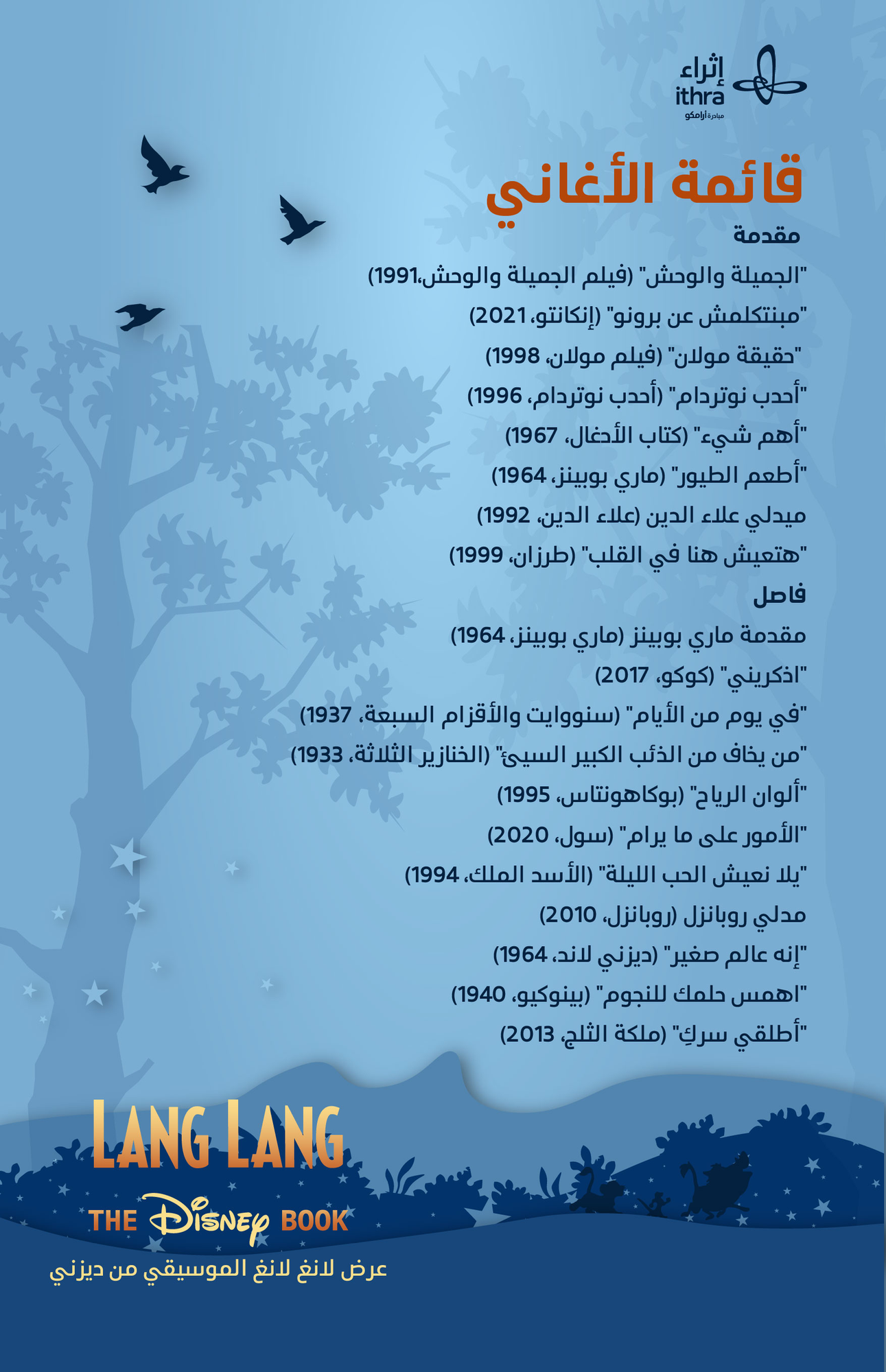حيث يدعوكم لانغ لانغ برفقةَ أوركسترا أكاديمية بيتهوفن إلى الاستمتاع بأمسية لا تُنسى للموسيقى الكلاسيكية، عبر تقديم عدد من المقطوعات الموسيقية الخالدة لأشهر أفلام ديزني مثل؛ " الأسد الملك " و"الجميلة والوحش" و"علاءالدين"، وغيرها الكثير. ويأتي هذا العرض الأدائي الخاص الذي يضم كلًا من جينا أليس، وبابلو جارسيا لوبيز، وبلينيو فرنانديز، وغو غان، والفنانة السعودية لولوة الشريف ليكون واحدًا من عشرة عروض حصرية يتم تقديمها في العالم والمنطقة.