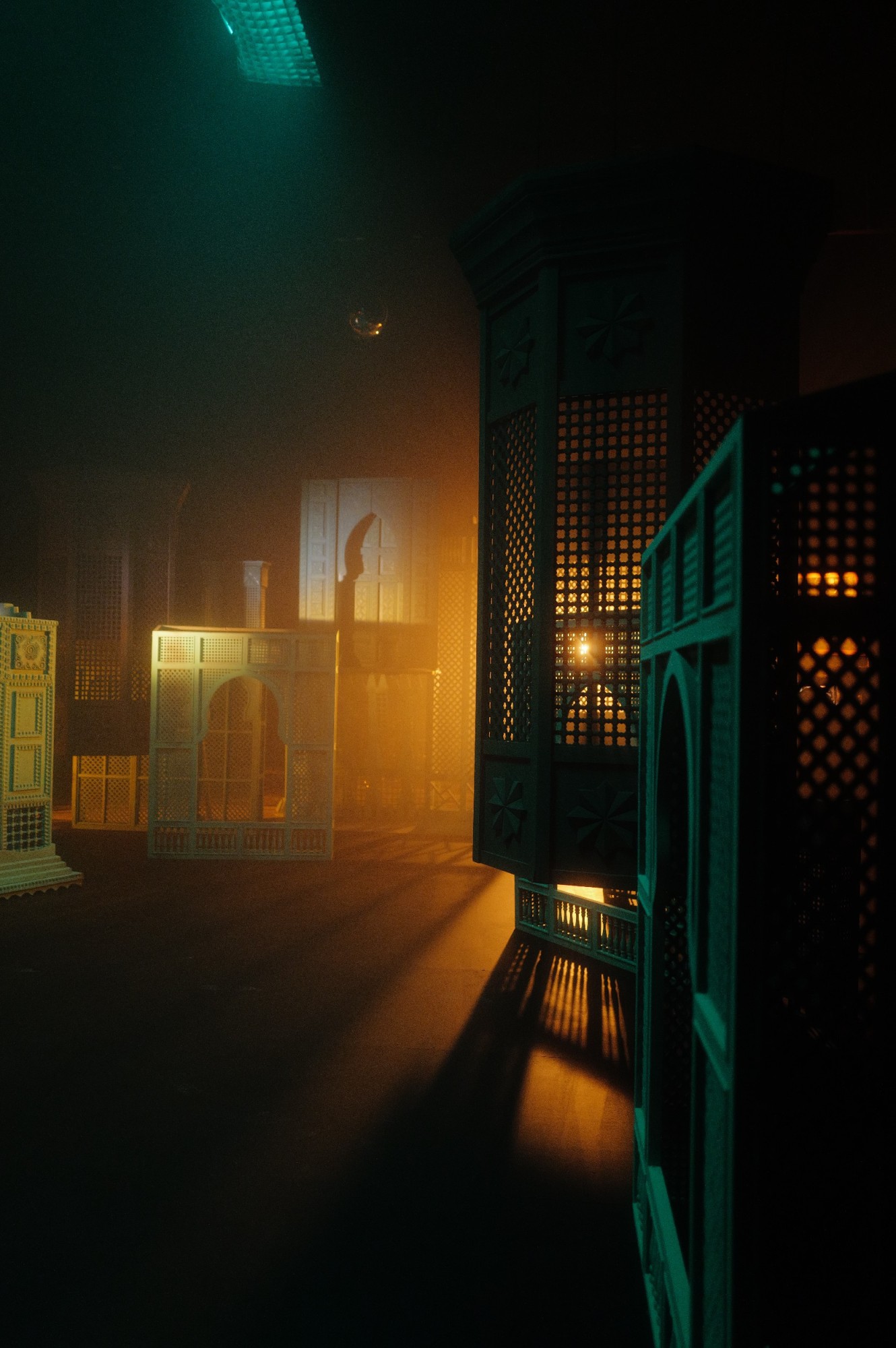 ومنْ غَربِ المملكةِ تتدلَّى "الرواشين" التي تُعدُّ منْ أهمِّ عناصرِ العِمارةِ التقليديّةِ، تجمعُ بين طابَعها الجَماليِّ ووظيفتِها المِعماريّةِ، وتظهرُ في العملِ، وهي تُحيط بالمكانِ، وبعازفِ القانونِ الذي يُطلقُ عبيرَ نغماتِه في الفضاء.