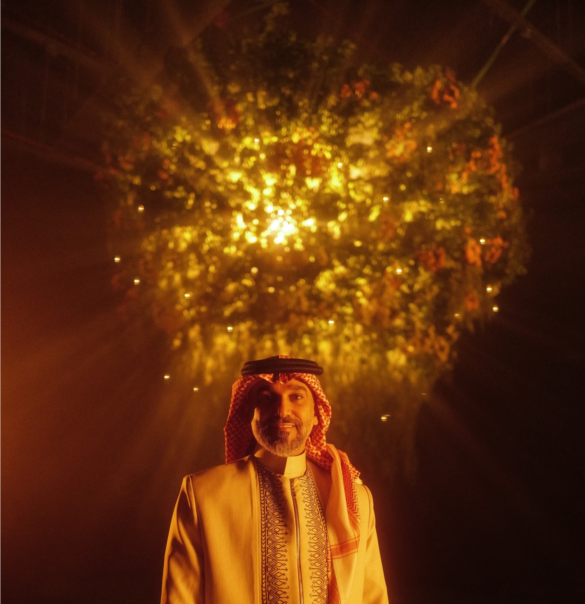 ويقفُ فريقُ الكورالِ وخلفَهم أعمدةٌ من نورٍ، تُمثِّلُ، وسَطَ المكانِ، أركانَ حكايةِ الوطنِ العزيزِ. وفيما تعبَقُ الأغنيةُ الوطنيةُ وتتوهَّجُ اللوحةُ الفنيّةُ، ويظهرُ العازفُ السعوديُّ القديرُ "مدني عبادي"، في حضورٍ احتفائيٍّ وهو يمرِّرُ أناملَه ببراعةٍ، في اتصالٍ بين العتبةِ الأولى لصناعةِ أغنيةٍ سعوديّةٍ متفردةٍ، وصولًا إلى حاضرٍ فنّيٍّ مزدهر، كانتِ السُّعوديةُ دائمًا في موضعِ القلبِ والروحِ لكلِّ فنانٍ وإنسان.