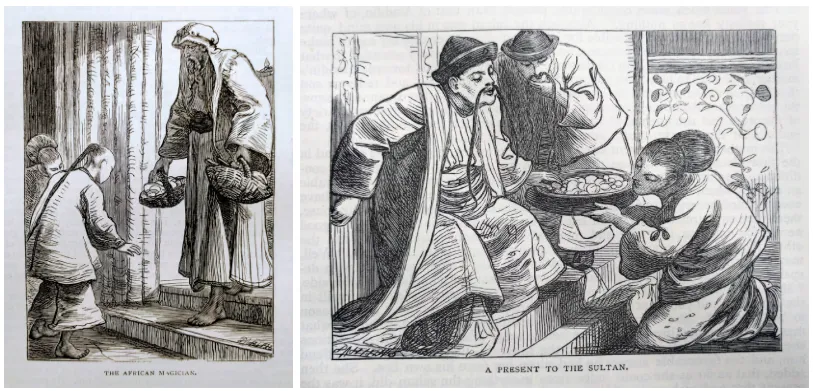 It is hard to parse how much of the tale of Aladdin came from Diyab versus Galland, but we do know that Diyab set the story in faraway China, most likely as a way to give it an exotic locale. We assume this since nothing else has changed to imply any Chinese culture (example the leader is a sultan rather than an emperor). Due to this Far East connection and the Orientalist exotification happening in the later Victorian era, subsequent portrayals and illustrations of Aladdin would play up the Chinese aspect, showing Aladdin with a stereotypically Manchurian hairstyle.