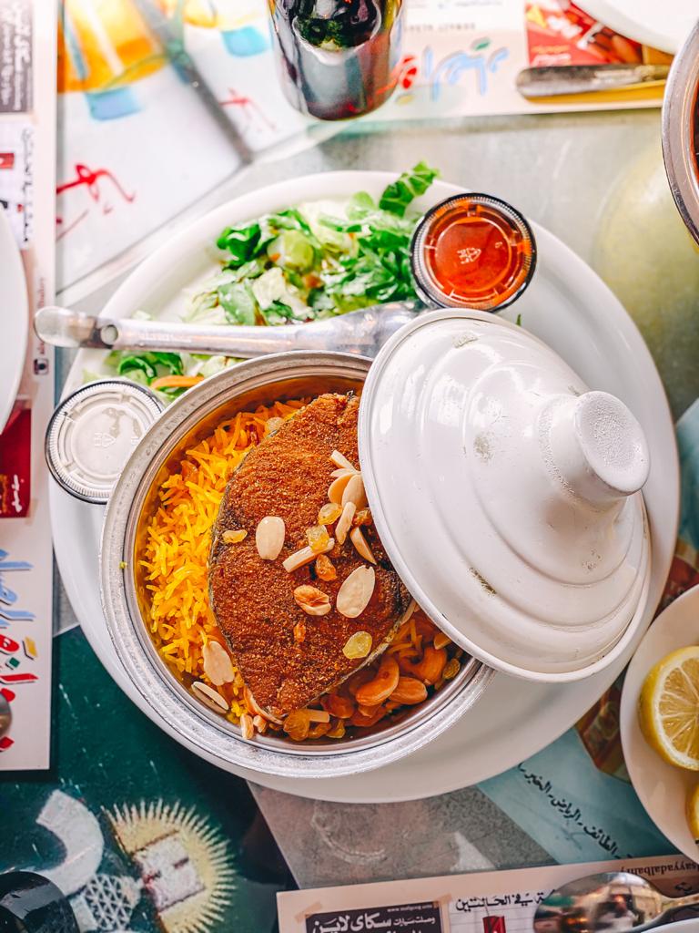This hidden gem serves Gulf traditional seafood cuisine and more. The look and feel of the popular restaurant is inspired from the late 70’s to the late 90’s and tells the life of the people of the East Coast. The restaurant offers authentic meals in a modern way, and focuses on the marine and coastal dishes that are popular to the people of the region. One of the favorite local dishes is the ‘Aish Muhammar’, translated to Toasted Rice, which is one of the ‘must have’ dishes from a Gulf kitchen. The dish is composed of rice, cooked with a little of sugar and date molasses and is served with fried fish (specifically the Mackerel) to even out the sweet and salt for the taste buds.