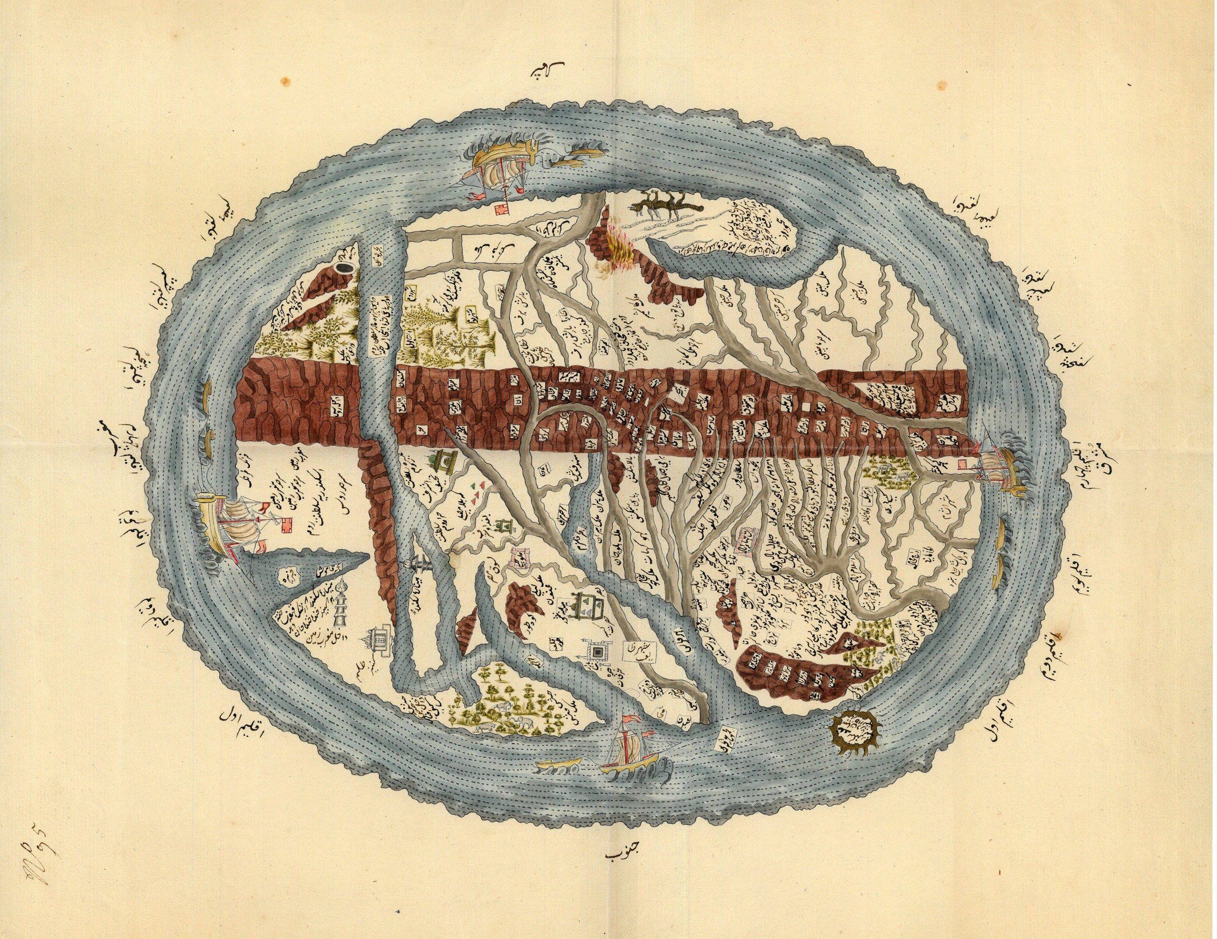 Map of the world centred on the Arabian Gulf, showing seven mosques or minarets. 18th century drawing of a lost 16th century Islamic world map, centred on the Gulf, showing the Great Mosque and Kaabah at Makkah, the Great Mosque at Madinah and five others in Iraq and North Africa. 500 x 420 mm. Oval manuscript map in ink and watercolour. Credit Anti-quariat Inlibris.